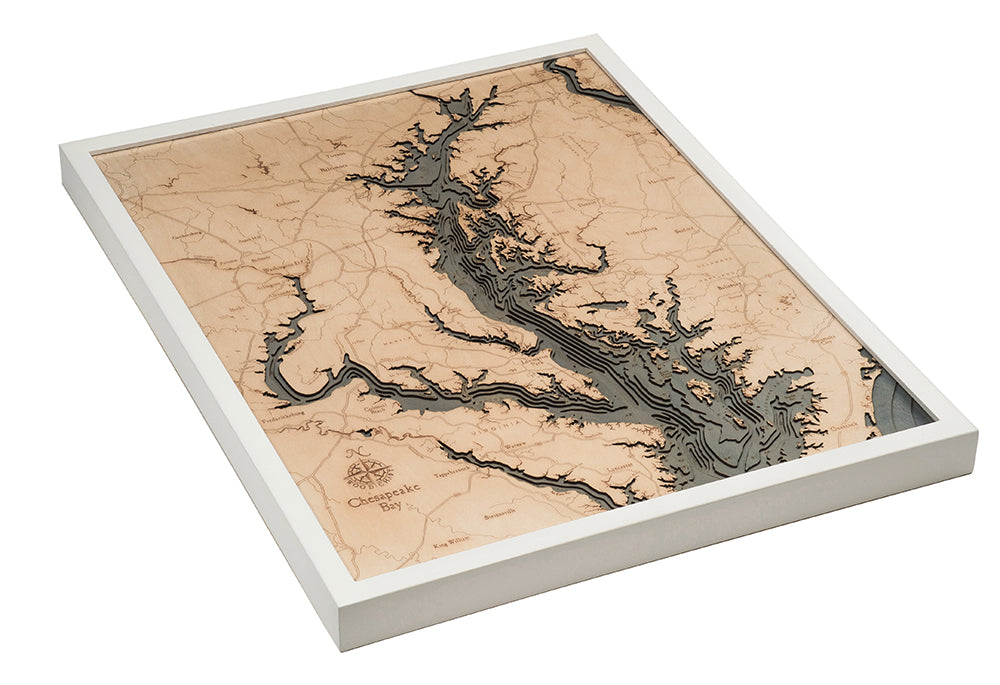 Our Chesapeake Bay maps are laser-carved into Baltic Birch wood providing an intricate, 3-Dimensional, meticulously accurate bathymetric depth chart. Our finishing techniques bring out the natural grain of the Baltic Birch, and the solid-wood frame provides a gorgeous solid border to your new 3-D artwork!