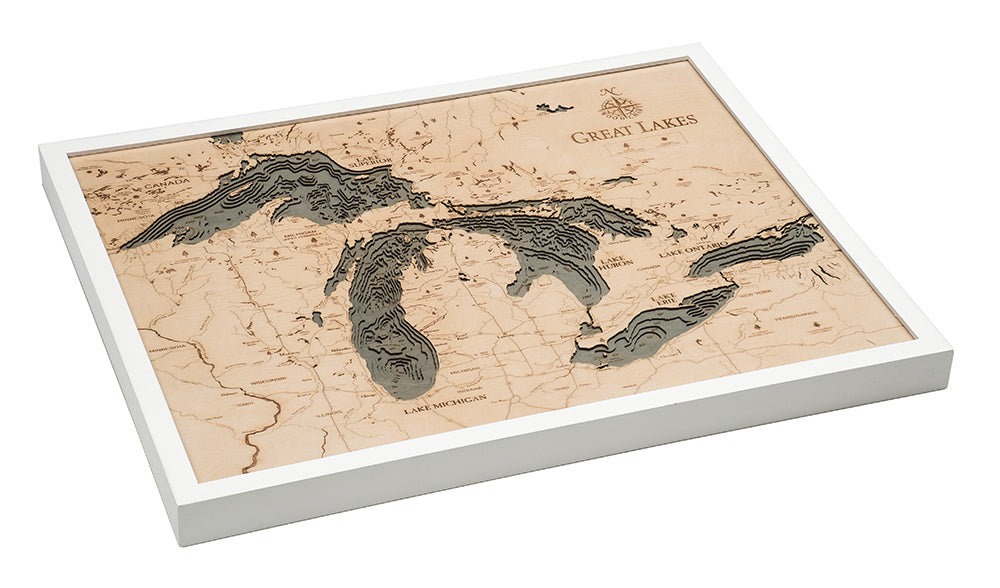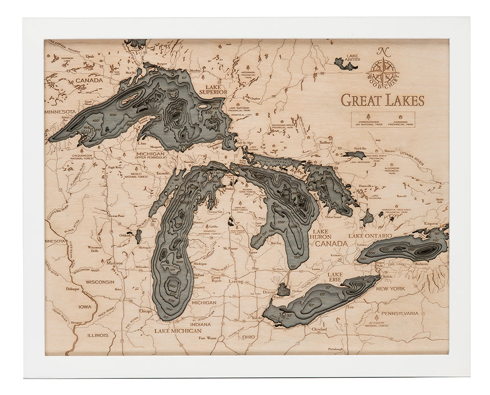 Our Great Lakes topographical map is laser-carved into premium Baltic Birch, creating a precise 3-dimensional bathymetric depth chart of all five lakes. Every contour, shoreline, and elevation change is carefully etched to highlight the true geography of the region. A solid-wood frame surrounds the artwork, and acrylic glass protects and enhances the details.