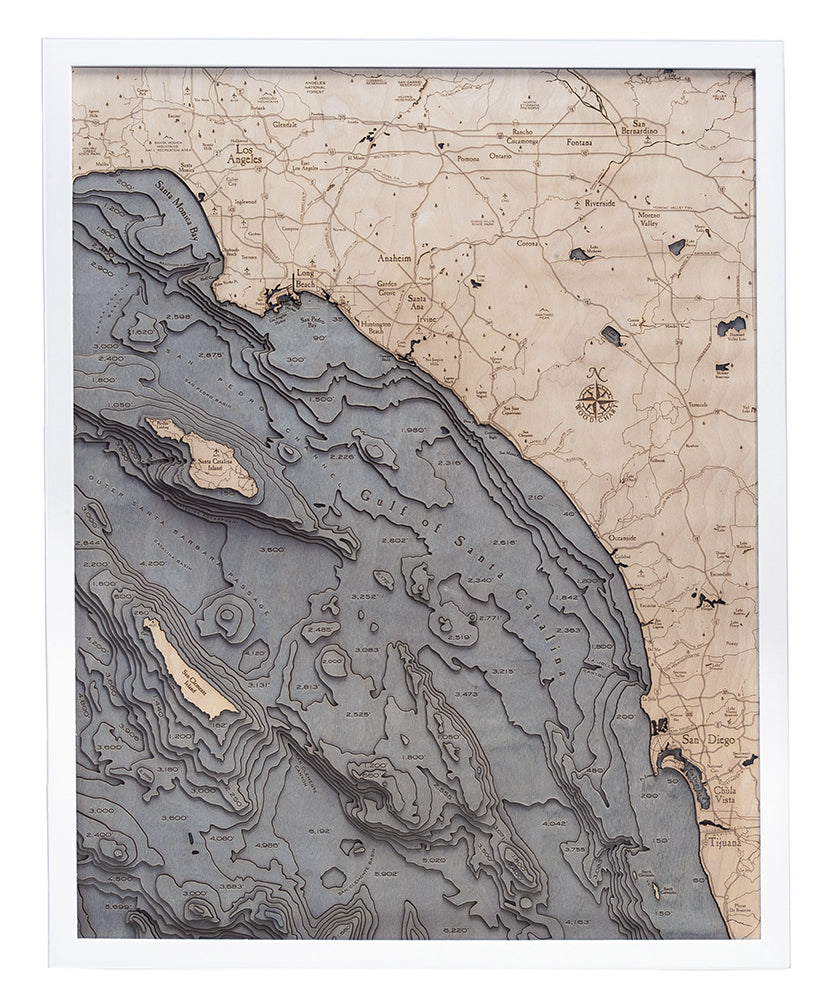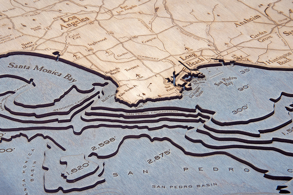Los Angeles to San Diego Wood Carved Topographical Depth Chart / Map